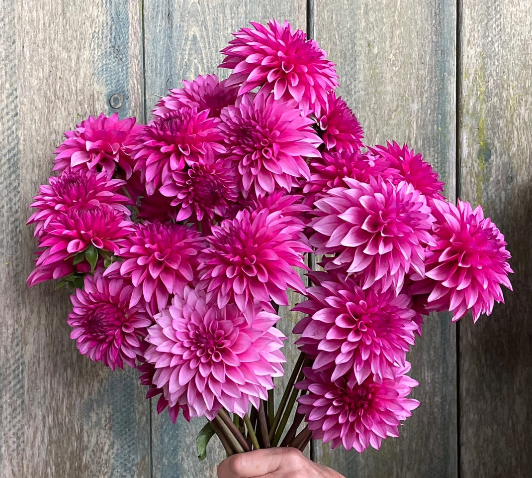 Striking in the garden, KA’s® Dinah Flo pumps out multiple pink-fuchsia blooms with a dark center. The pointed petal tips make this one of our favorites for this year. Loved by our local florists for bright bunches.