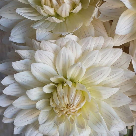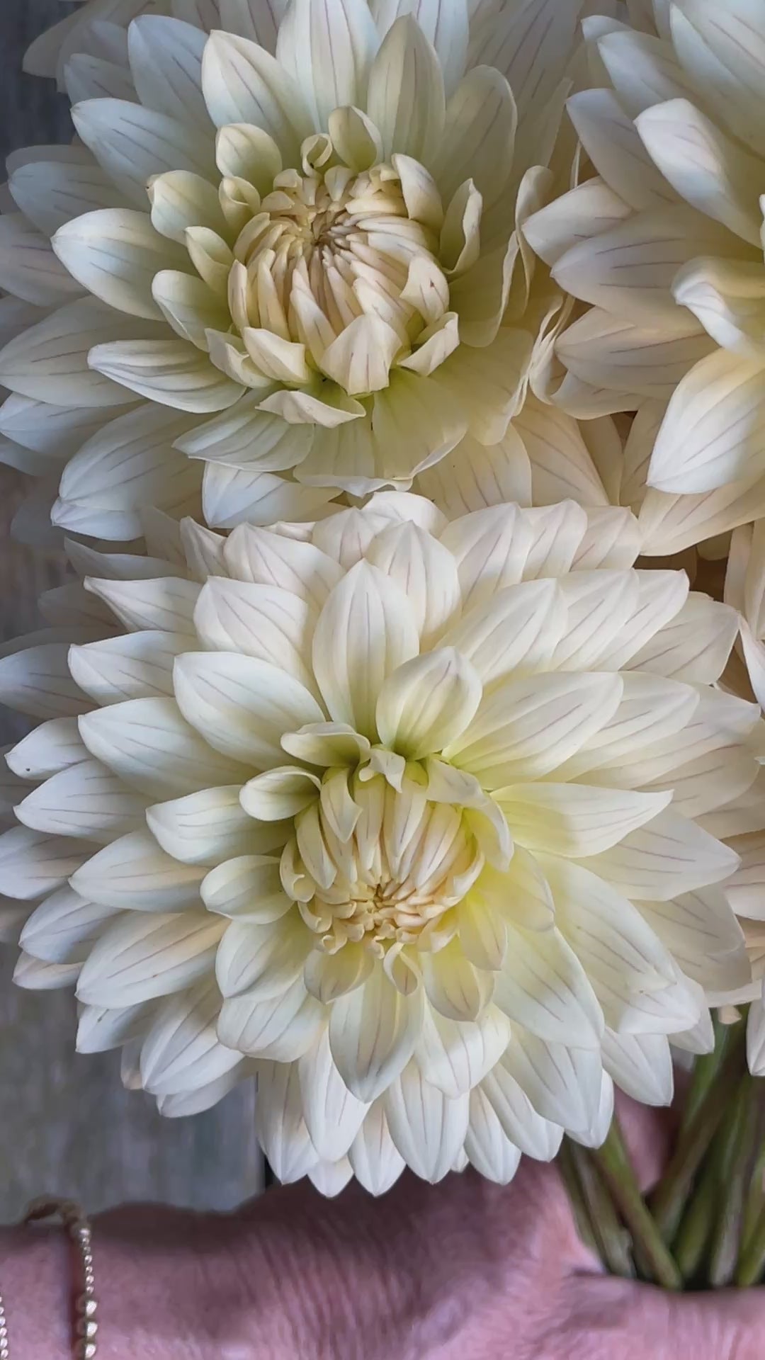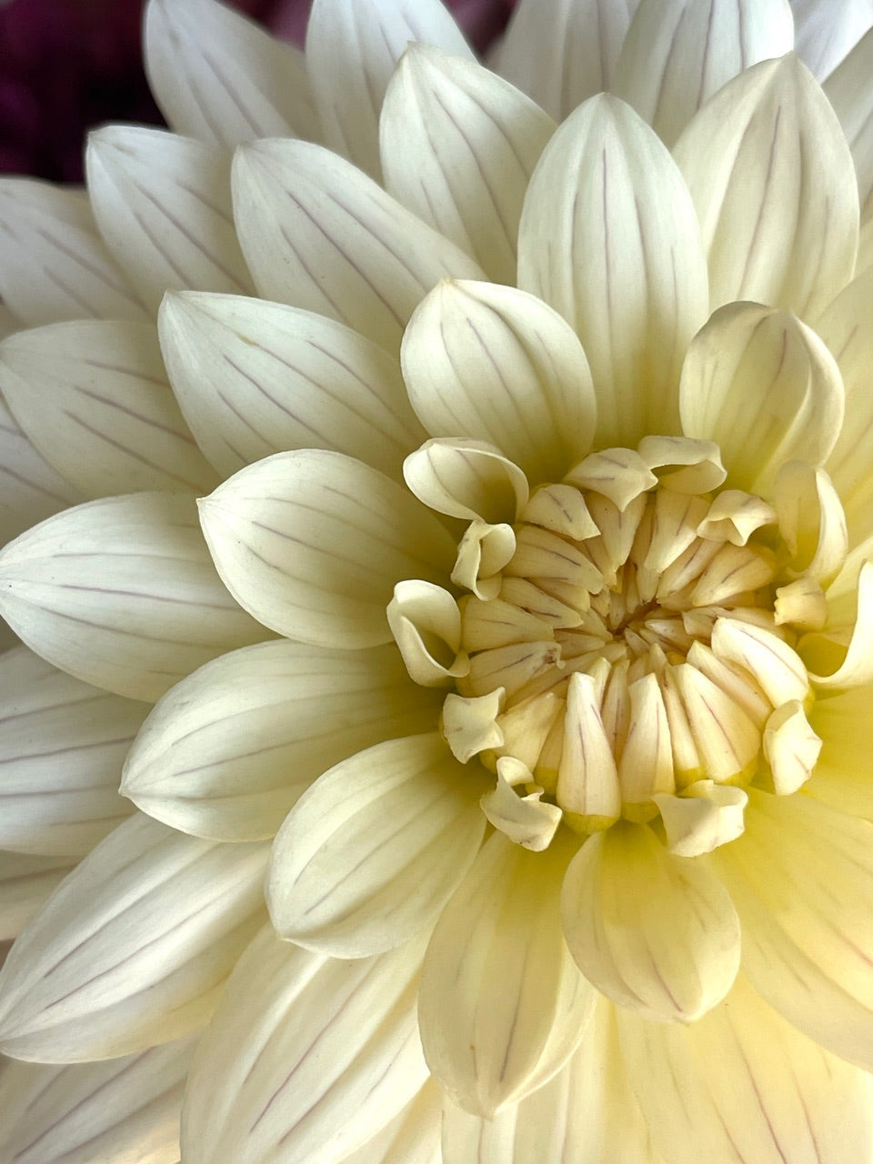This introduction has a truly novel form that doesn’t fit any established categories. Adding to the novelty, the cream-colored petals have subtle pink stripes. There is nothing else like this on the market.