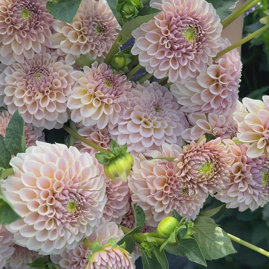 KA’s Cinder Rose combines tip-top performance with show-stopping beauty. There are not enough adjectives to describe the subtleties of this variety. It is a spellbinding blend of pink and mauve, with the faintest gold tips. KA’s Cinder Rose holds its tight miniature formal decorative form all season long and rarely pops its center. Every bloom in our patch is beautiful and sellable. One big feature of this variety is that it performs well in hot climates. You can’t do better than this in our book.